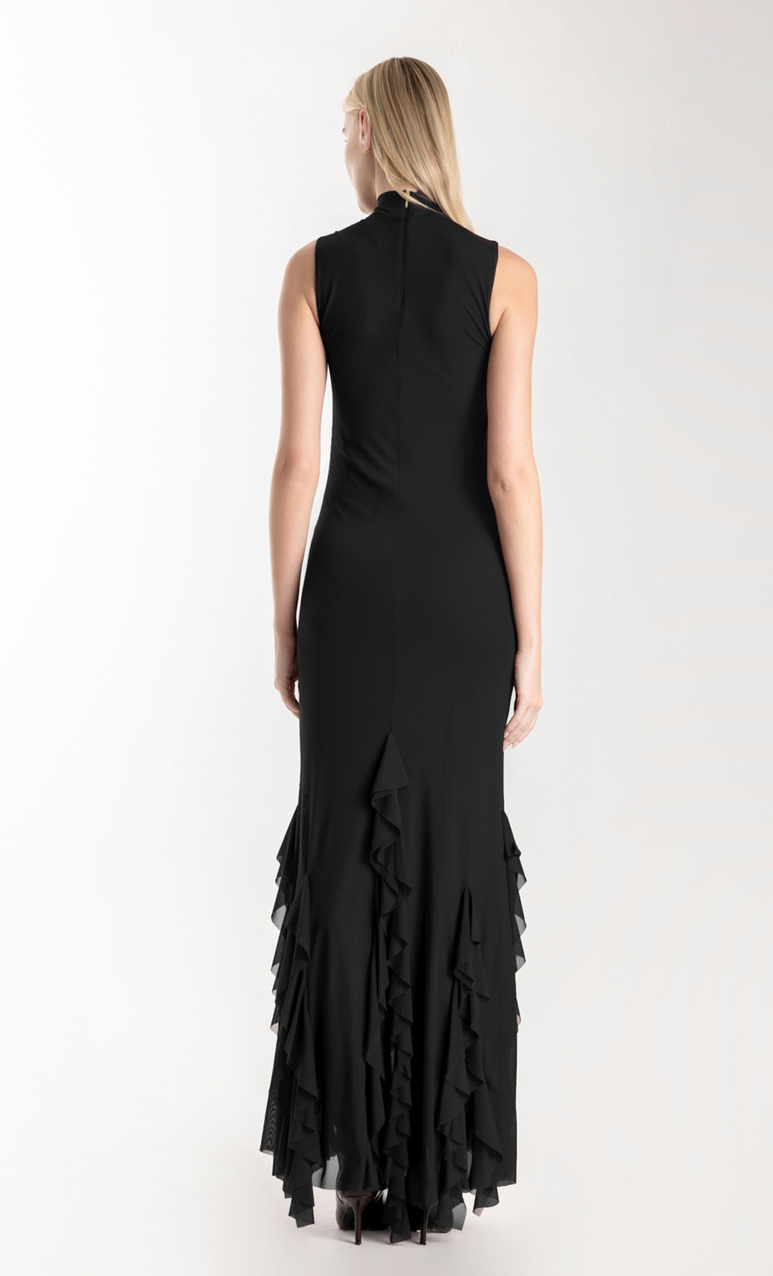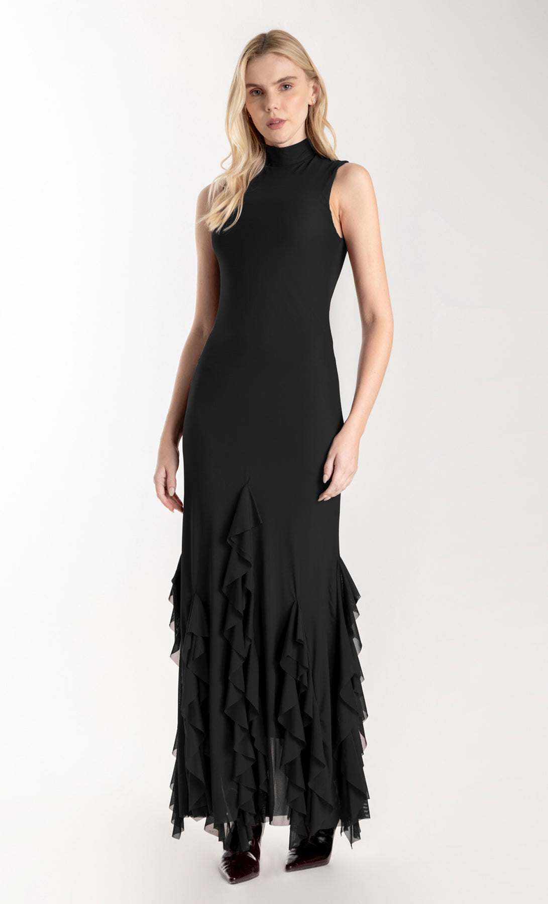 An iconic Especia design that’s back to win hearts. The Aneta Black maxi dress enhances the figure with its fitted cut and high neckline, radiating sophistication. The cascading ruffle skirt adds movement and a romantic touch that captivates with every step. An timeless piece perfect to shine and stand out on any special occasion.