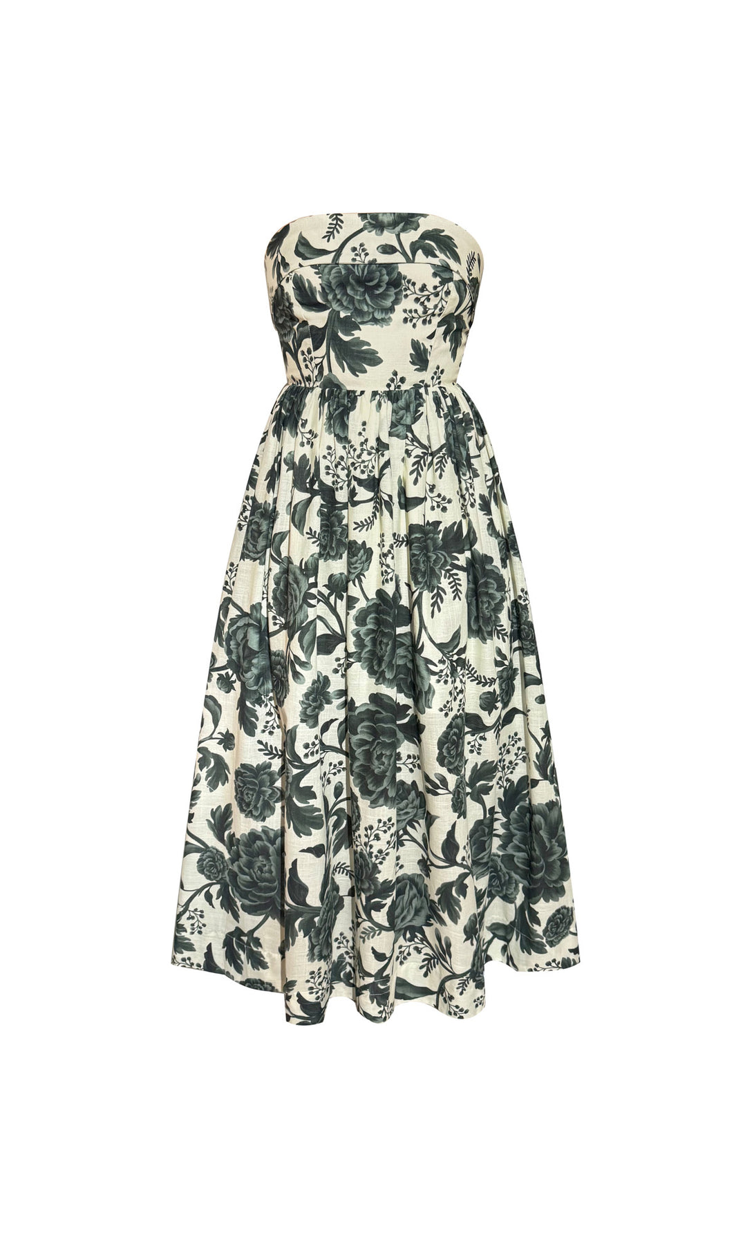 The Micrantha midi dress is a tribute to the feminine silhouette. Its strapless neckline gracefully frames the shoulders, while the fitted waist enhances the figure. The voluminous skirt adds movement and presence, creating a look that feels both delicate and full of character. Its length makes it perfect for special occasions, striking the ideal balance between sophistication and charm.