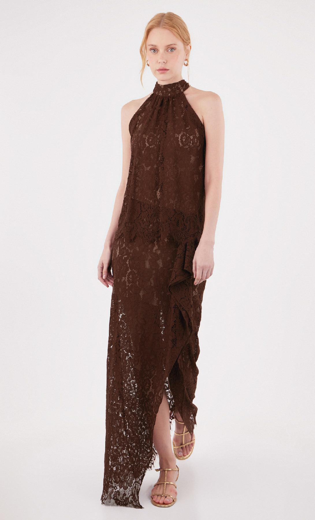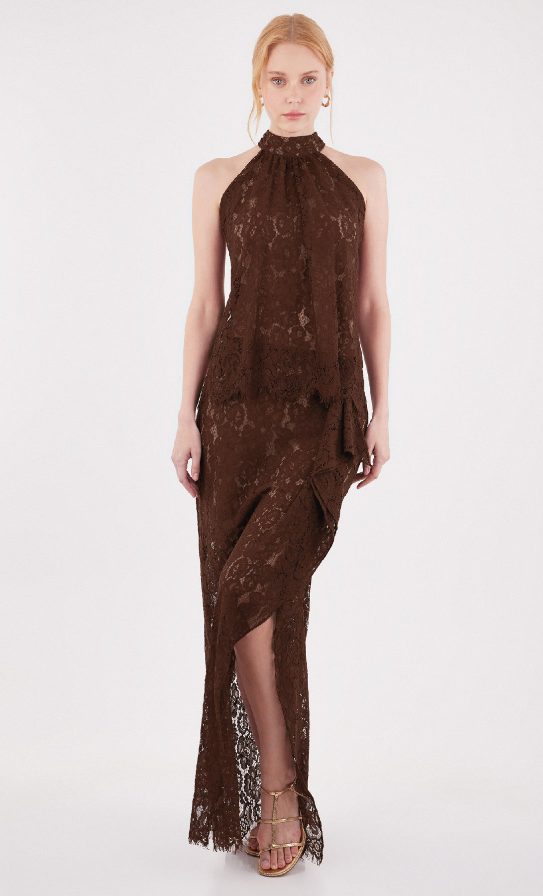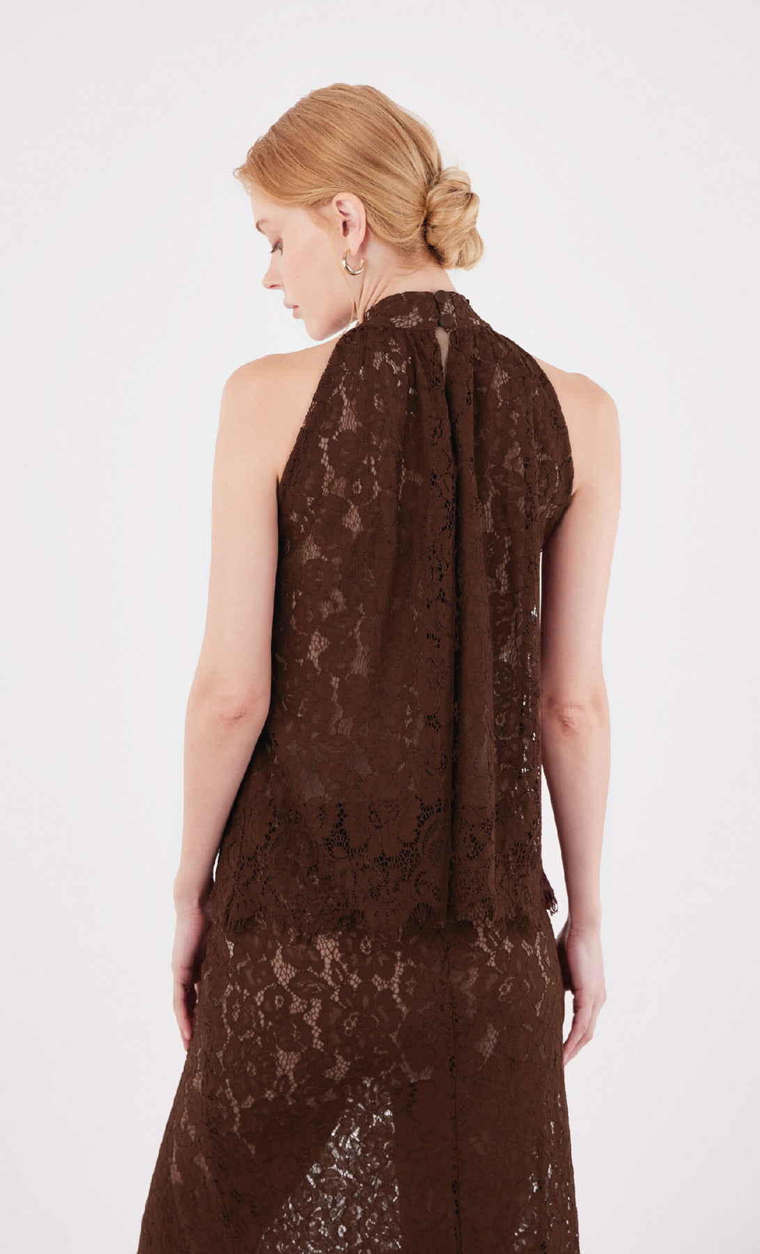 The Mousse Blouse combines comfort and style with a sophisticated touch. Its loose silhouette offers freedom of movement, while the halter-style neckline and high neck with tie straps add a feminine and elegant detail that elevates any look. Made from Especia exclusive lace fabric. Perfect to pair with the Jade Chocolate long pants.