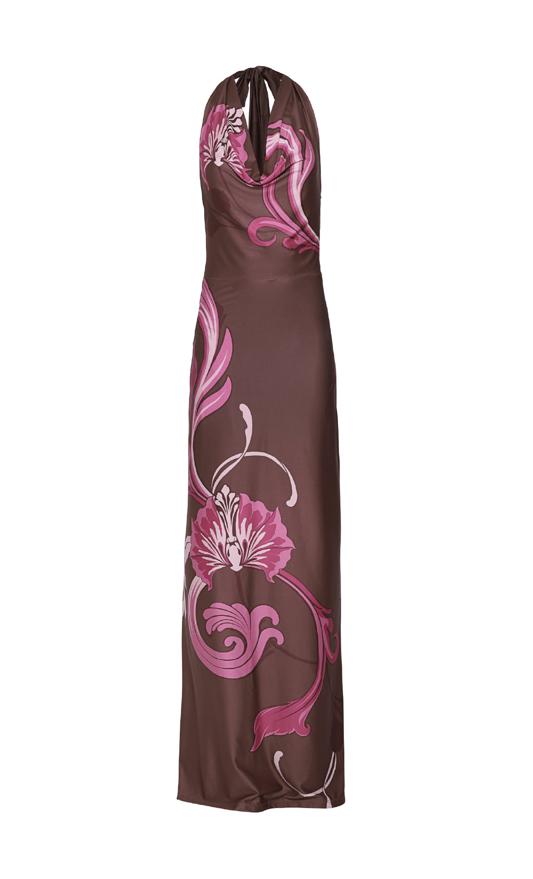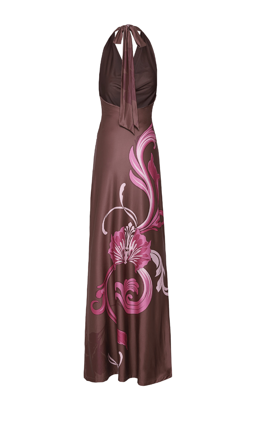 The Moonflower Brown Dress embodies modern elegance, designed to highlight the figure with a fitted silhouette that gently embraces the body. Its draped neckline adds movement and sophistication, while the tie-up straps at the neck allow for a personalized fit and a uniquely feminine touch. Crafted with Especia exclusive print. Its brown tone brings warmth and versatility.
