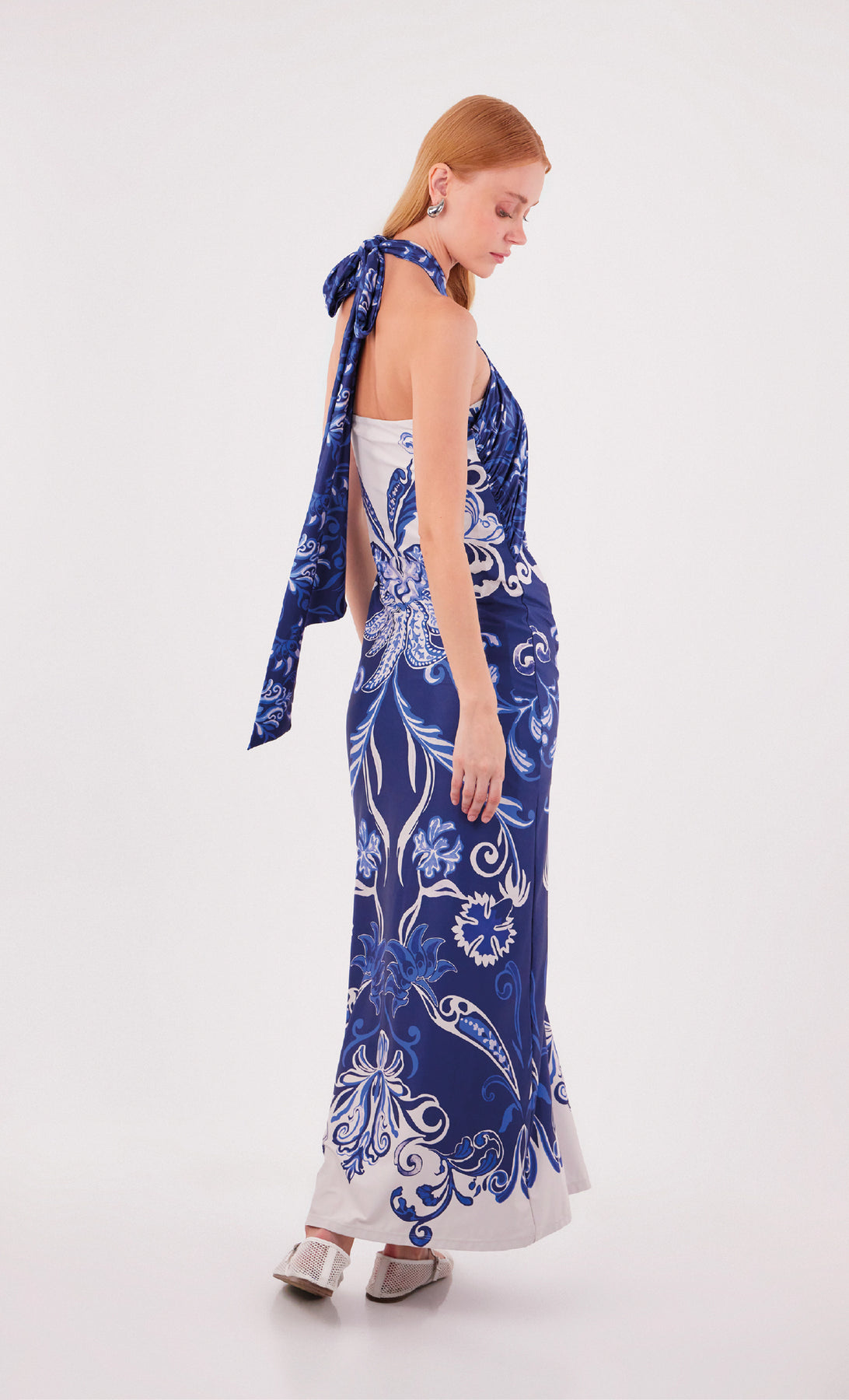 The Ramtin Tiles maxi dress stands out with its figure-hugging silhouette, designed to enhance the body with elegance. Its crossed halter neckline, paired with tie straps around the neck, adds a modern touch that creates a sophisticated and feminine look. The exclusive Especia print wraps the piece in a unique character full of personality.