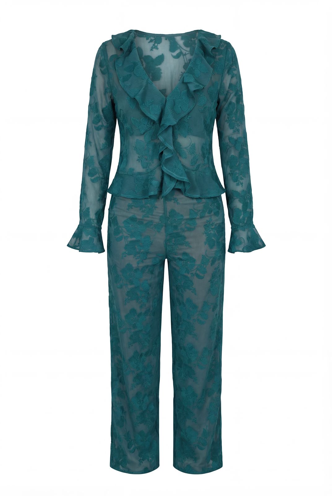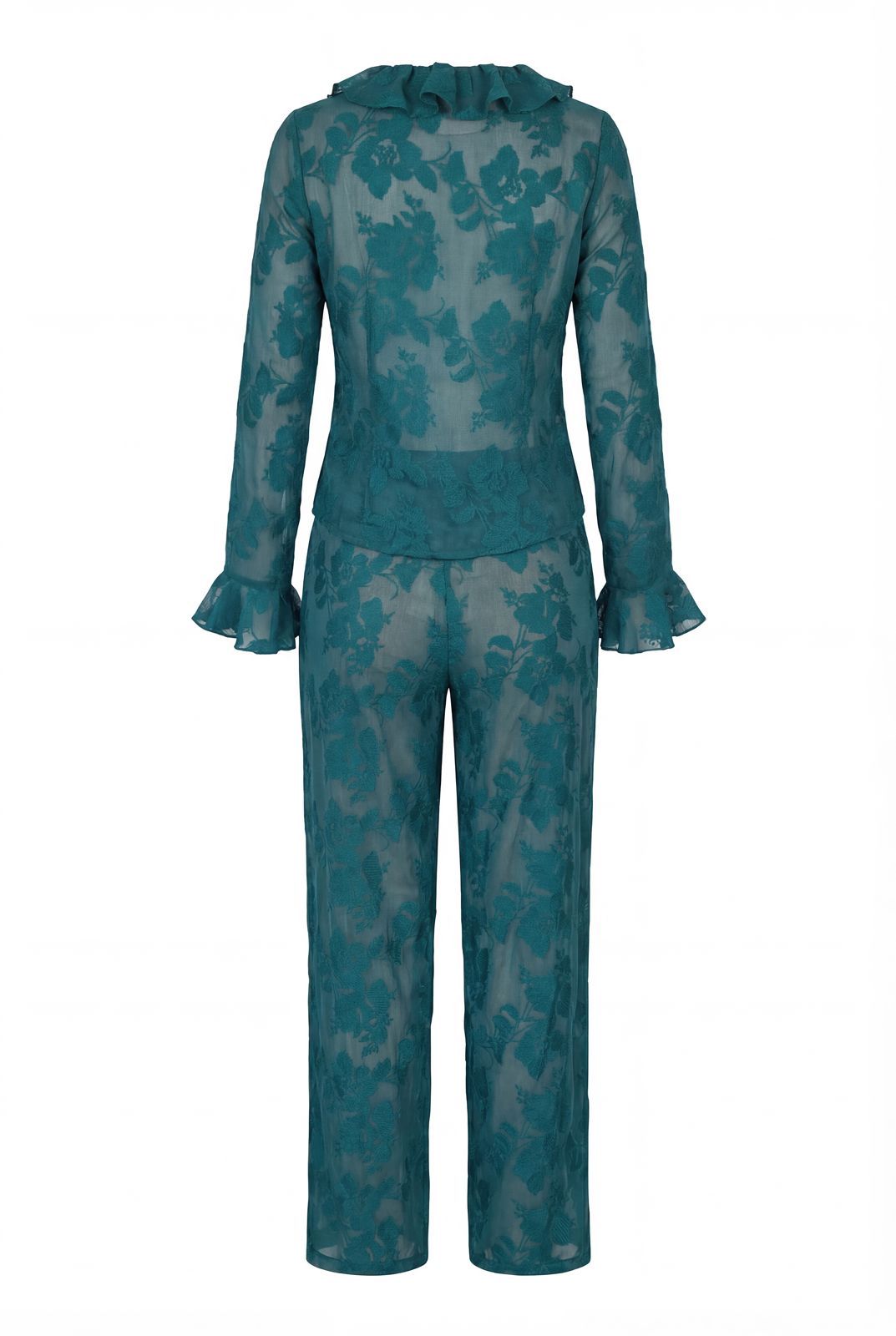 Sophie Pants high-rise pants with a touch of natural elegance. Their wide silhouette and straight-leg cut flatter the figure, offering a fluid and sophisticated drape. They feature an inner mallatex lining that provides comfort and a flawless finish. Crafted in Especia exclusive embroidered chiffon, they pair beautifully with the Aryana Bloom blouse.