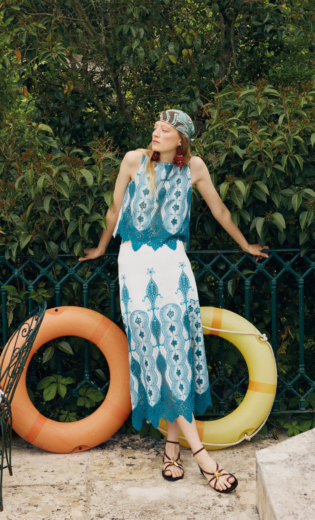 The Mistral blouse is an essential piece with a romantic, handcrafted feel. Featuring sleeveless armholes and a loose silhouette, it offers freshness and comfort without sacrificing elegance. Made from Especia exclusive eyelet-style fabric, it stands out for its unique texture and natural inspiration. Perfectly pairs with the Delfos midi skirt.