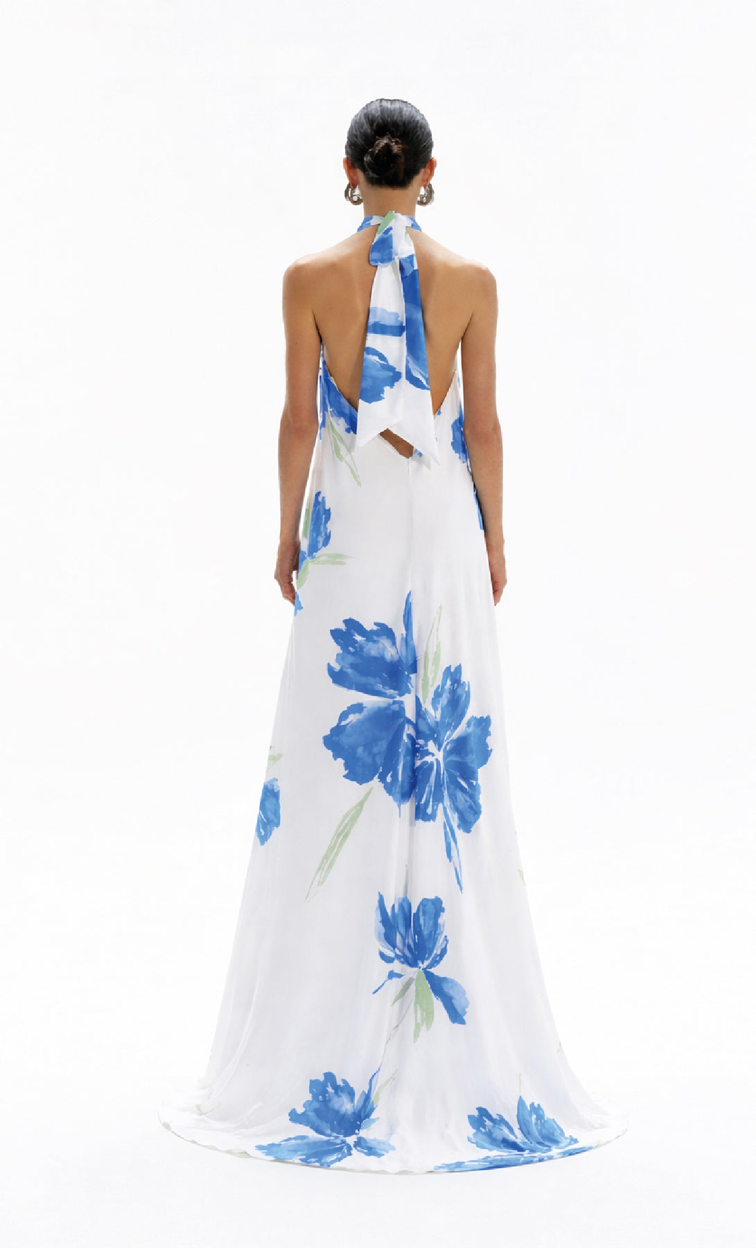 The Acidic Laie maxi dress features a flowing, wide silhouette that adds movement and elegance. It has a halter neckline with a front teardrop cutout, adding a feminine and sophisticated touch. Its design is highlighted by Especia exclusive print, making it ideal for special occasions or daytime events.