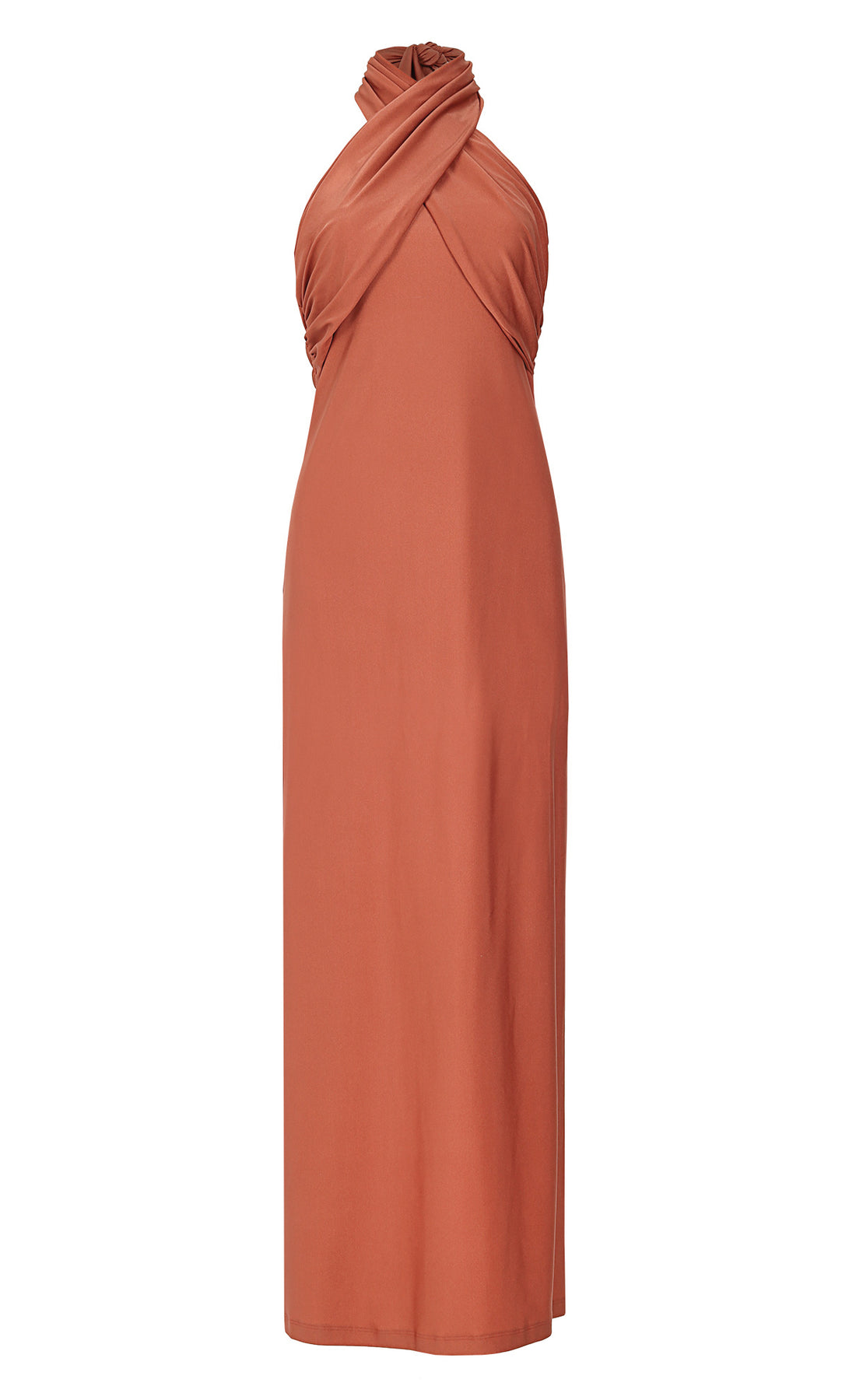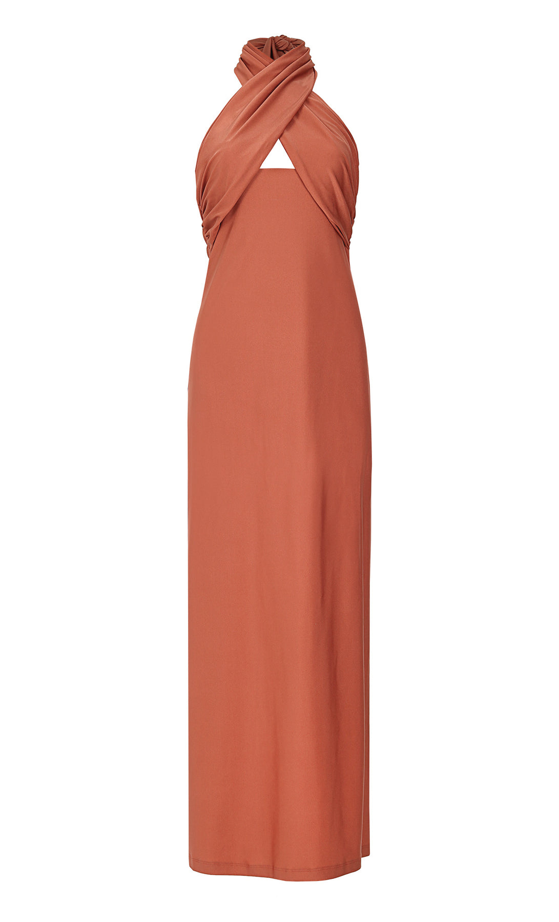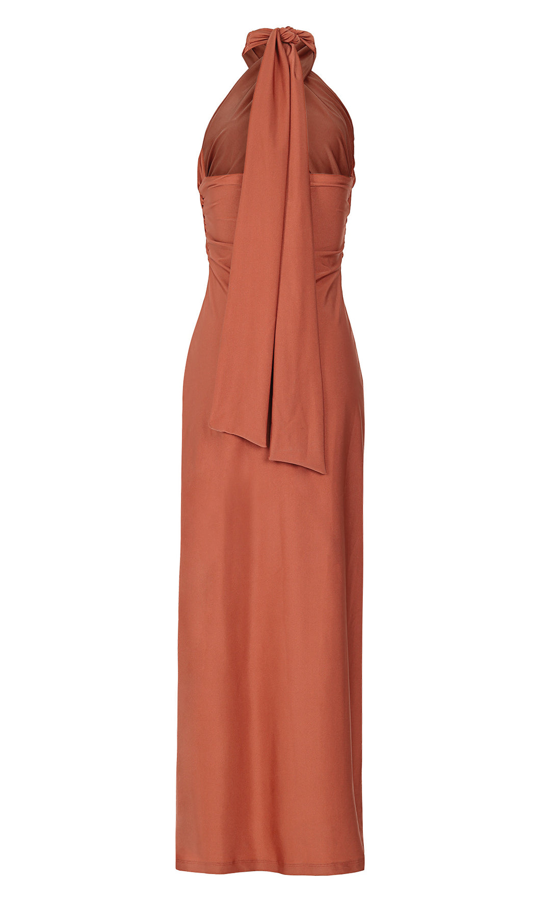 The Kim Clay Long Dress is the definition of modern, sophisticated elegance. Its fitted silhouette highlights the figure with a feminine and bold touch perfect for standing out on any occasion. The tie up straps at the neck allow for a personalized fit and add a romantic, delicate feel to the design. In its Terracotta tone, this dress becomes a warm and versatile piece.