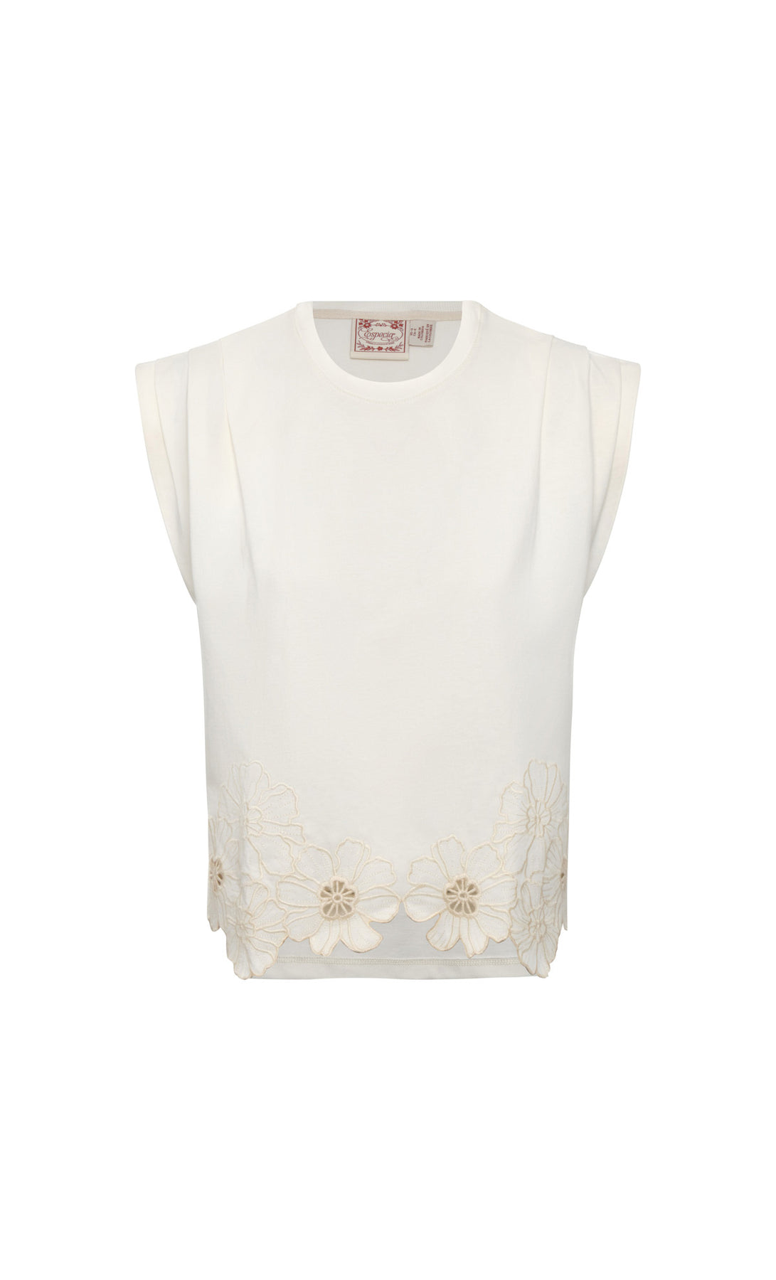 A delicate piece that stands out for its design. The round neckline and sleeveless cut with subtle pleats at the shoulders add a touch of structure and femininity. The exclusive Especia embroidery along the hem makes it a unique piece to instantly elevate your looks.