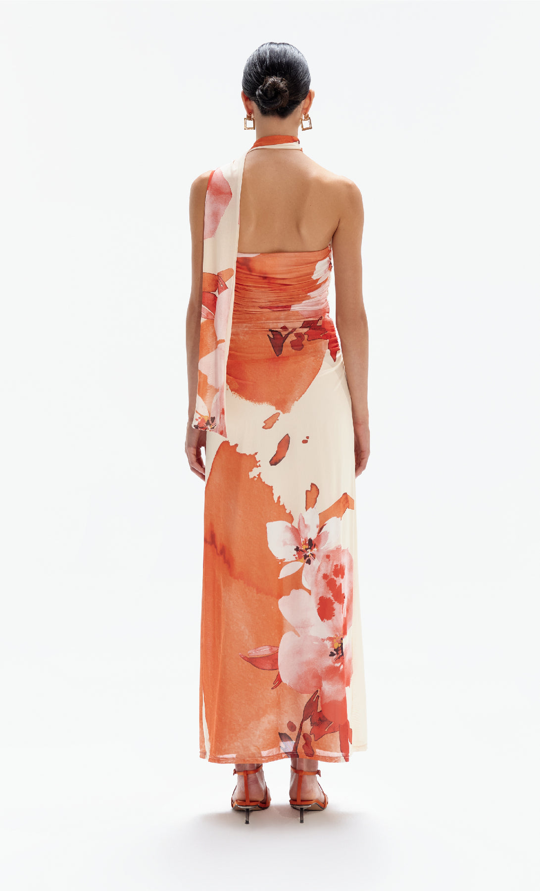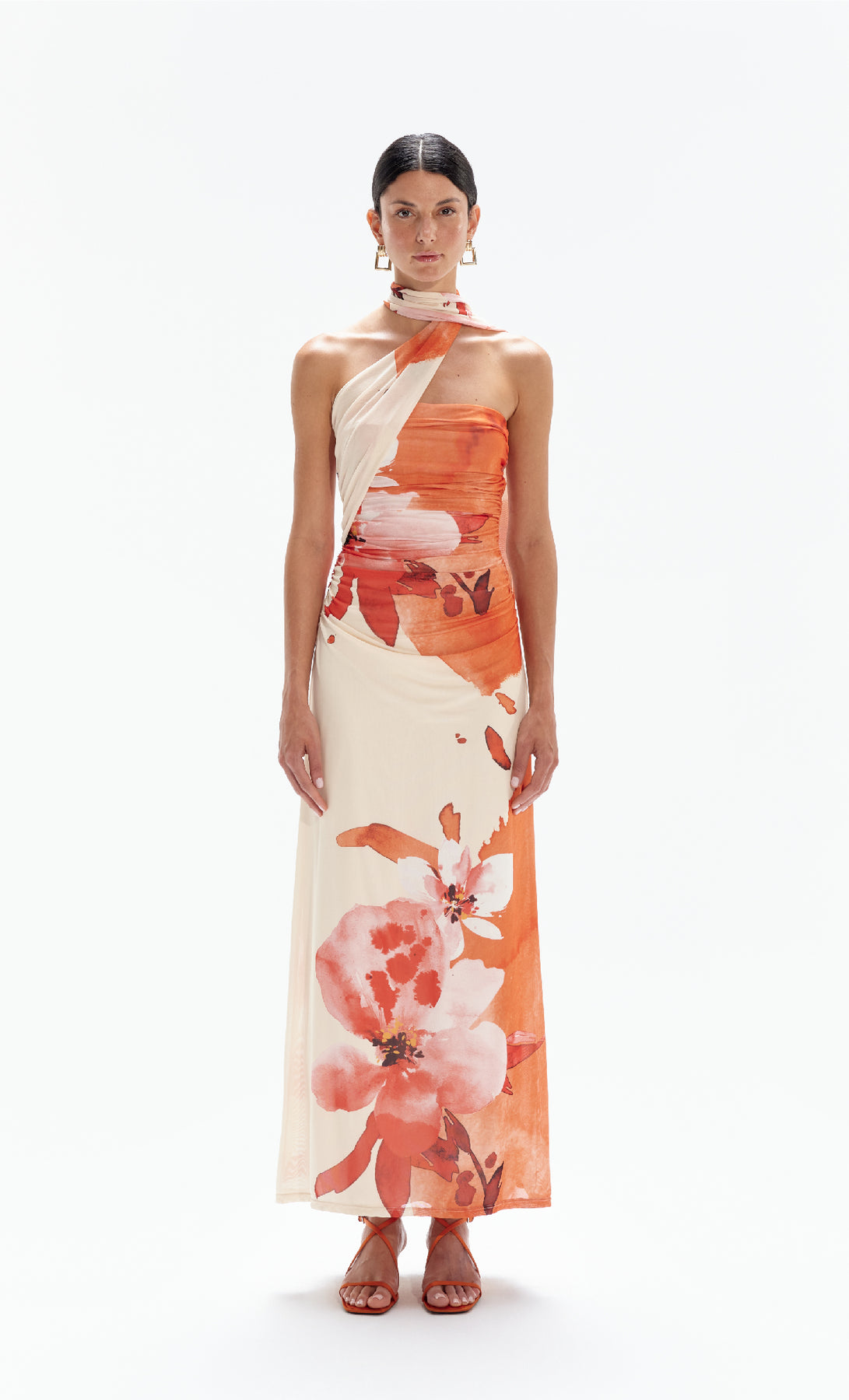 The Mai–Tai dress is designed to enhance the figure in a sophisticated way. It features a straight neckline with side draping that creates a subtle ruched effect, adding texture and elegance to the design. Includes a side strap to tie at the neck, adjustable in multiple ways to personalize your look. Its design is distinguished by Especia exclusive print, making it ideal for special occasions.
