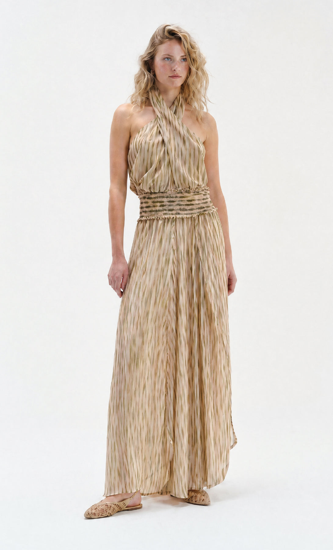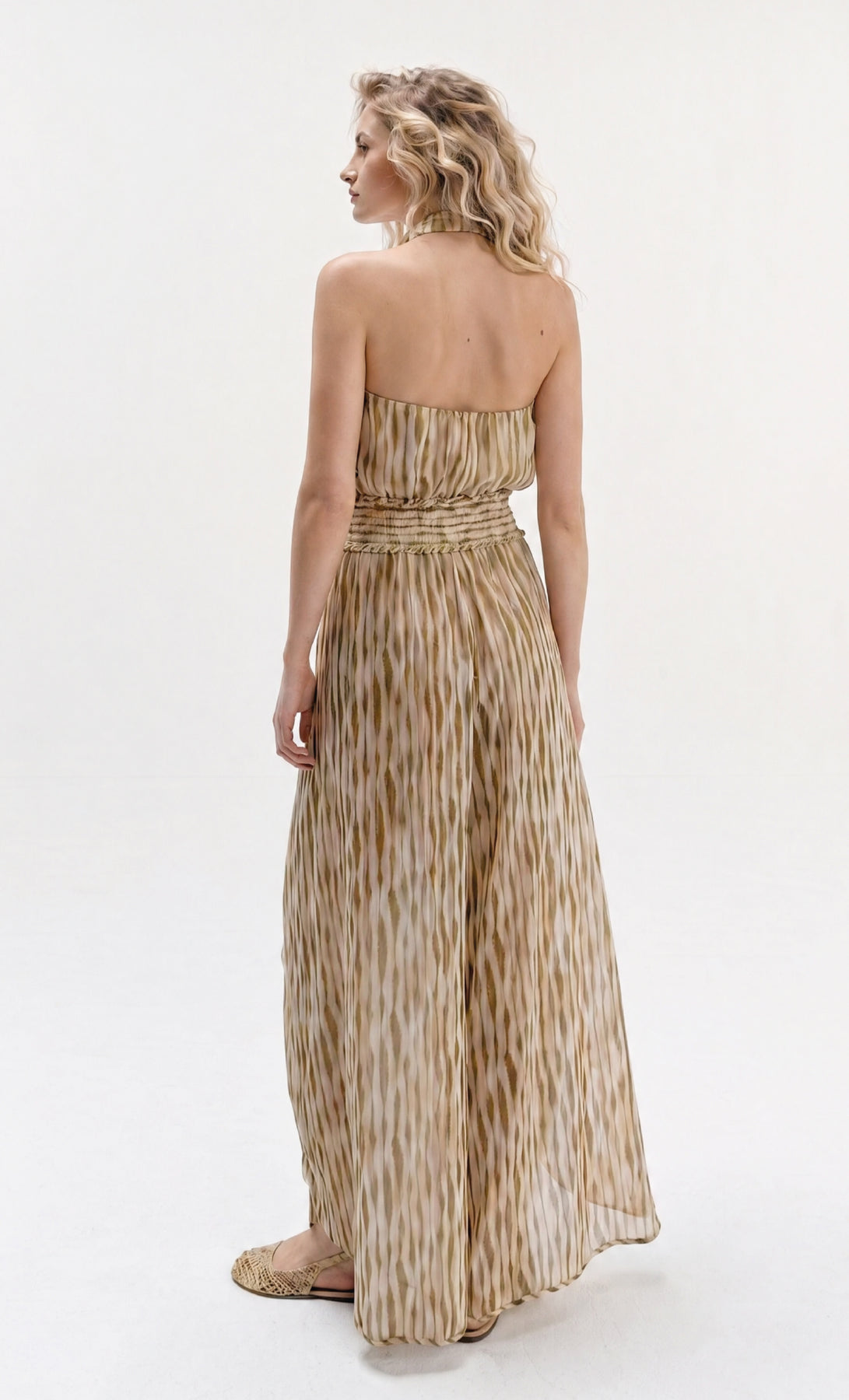 The Adair jumpsuit features a halter crossover neckline that frames the shoulders, while the elasticated back and smocked waistband provide a comfortable, adaptable fit. Its wrap-style design creates a flowing effect that moves naturally with the leg. It includes inner nude mesh shorts for added coverage and security, and is finished with an exclusive Especia print.
