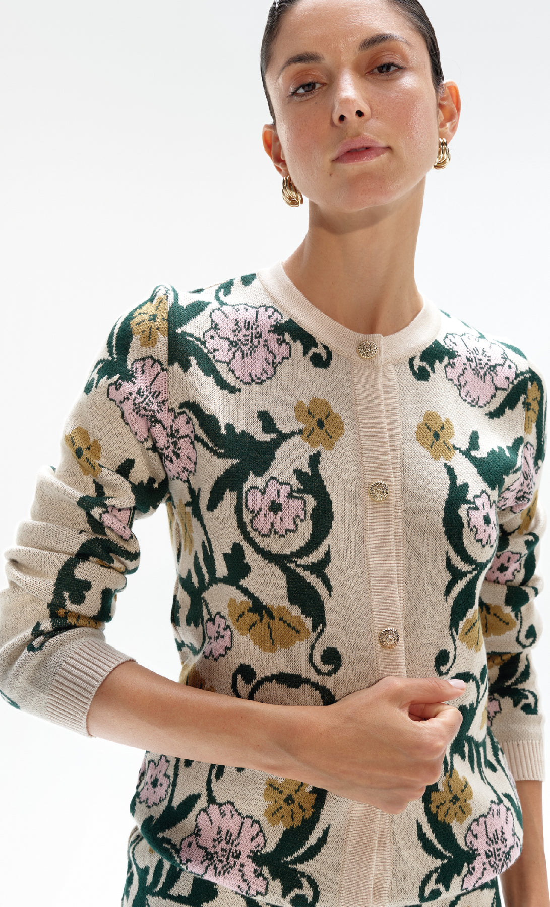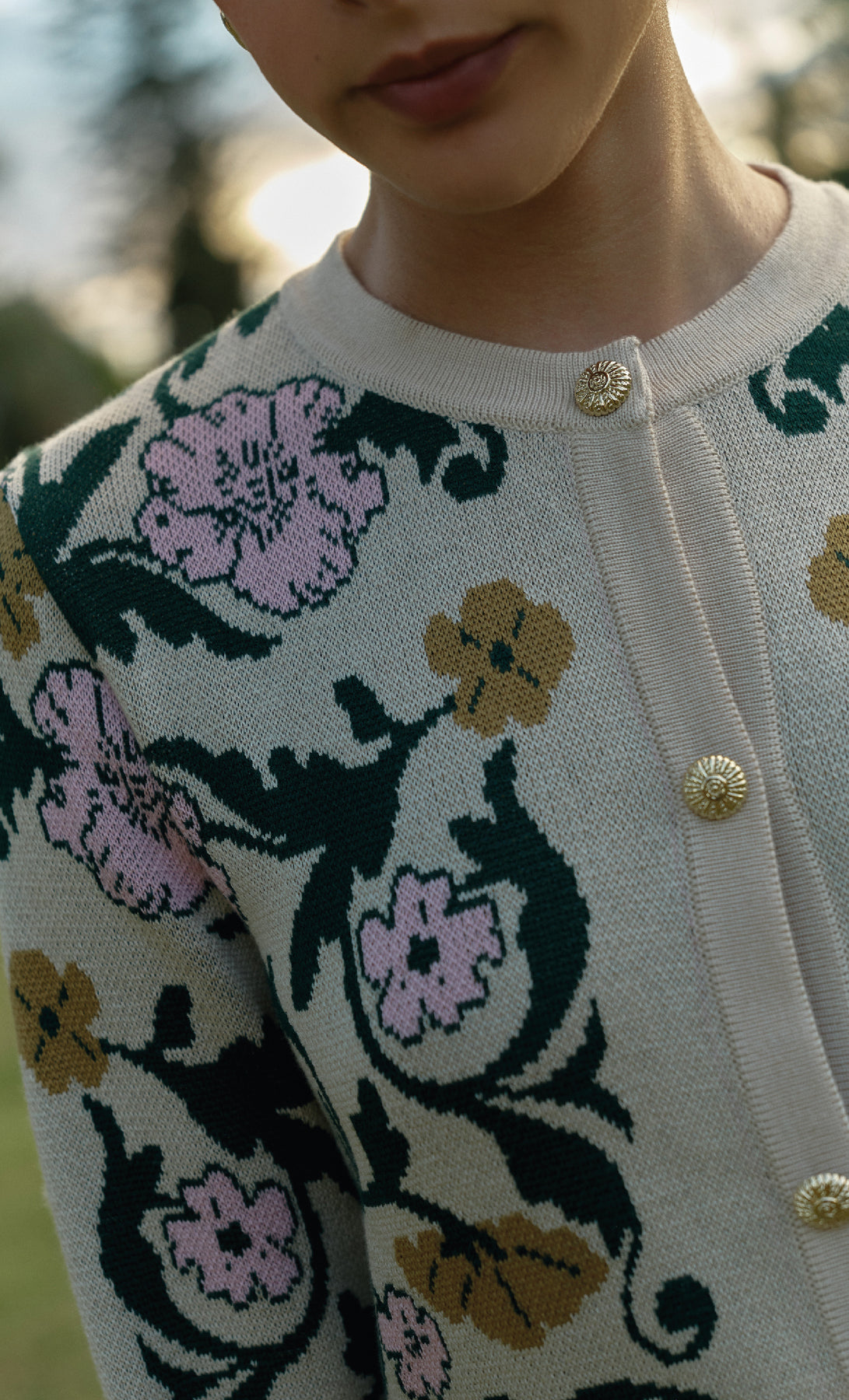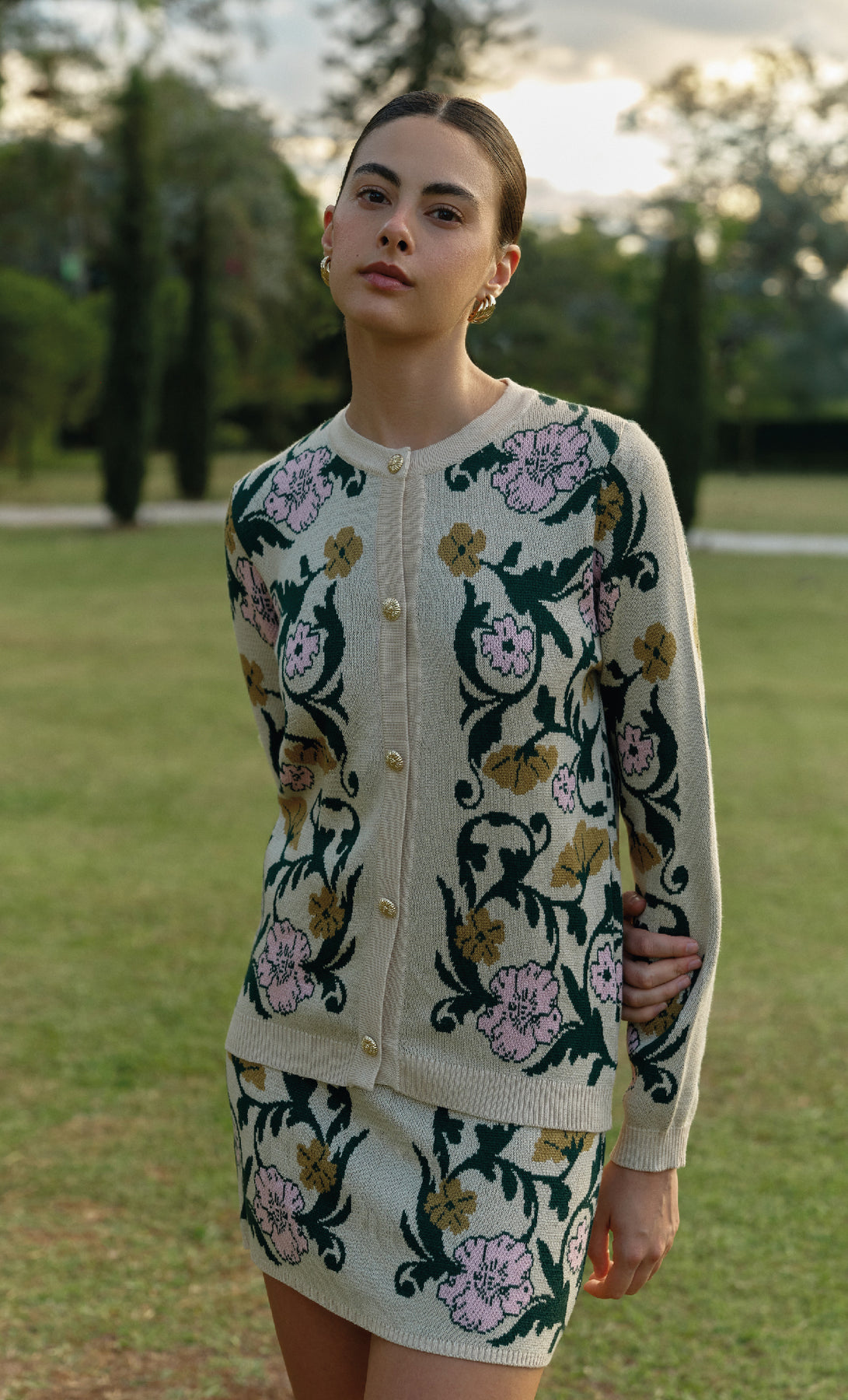 The Blair long sleeve knitted sweater is a special piece with a romantic touch, adding softness and style to any outfit. It features a front button closure and exclusive artwork by Especia, giving it a distinctive and unique character. Perfect to pair with the Georgina short skirt.