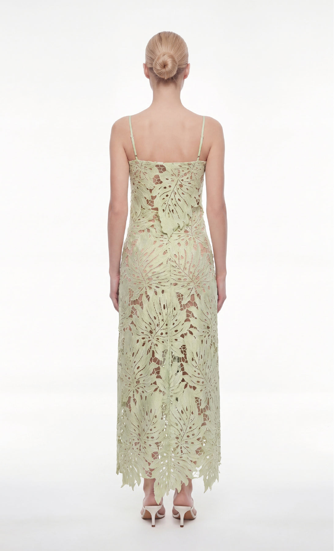 The Poire Celadon crop top is designed with a straight neckline and delicate, adjustable thin straps for a perfect fit. It includes an internal nude mallatex top that provides added comfort and support. Crafted from Especia exclusive guipure-type fabric, it stands out for its sophisticated texture and unique details. Ideal for pairing with the Lantana Celadon skirt.