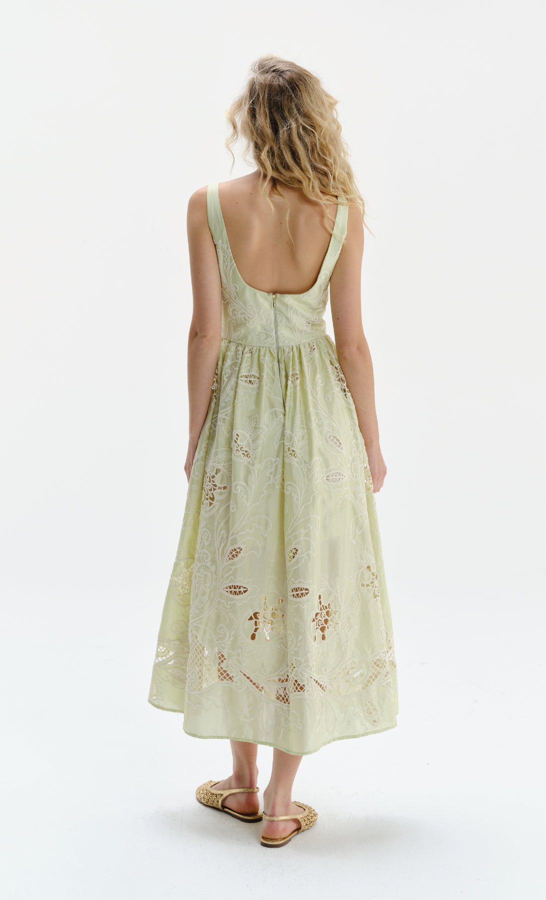 The Mossy Green midi dress features a semi-fitted silhouette that balances structure and fluidity. The square neckline frames the bust with a modern feel, complemented by a delicate gathered detail. The full skirt adds movement and freshness, while the back zipper closure ensures a clean fit. Crafted from Especia exclusive eyelet fabric with cutout details, it stands out for its light and feminine texture.